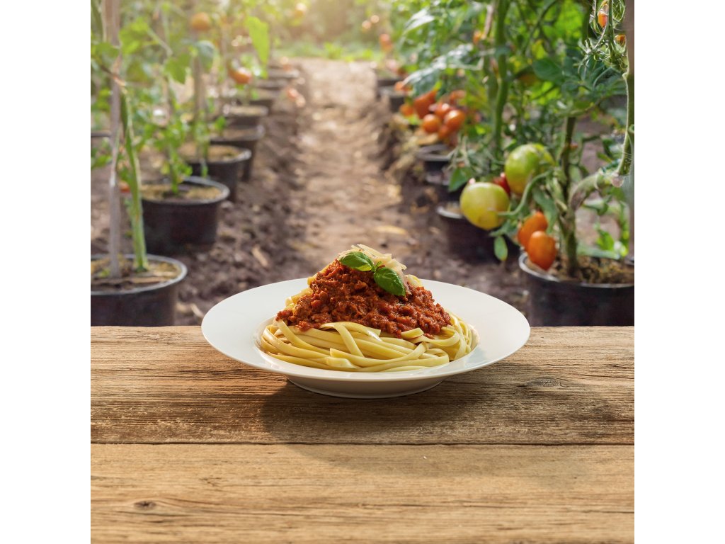 Bezmasá, italská omáčka ve veganském provedení s přírodním tempehem a chuťovou harmonií rajčat, kořenové zeleniny a středomořských bylinek.