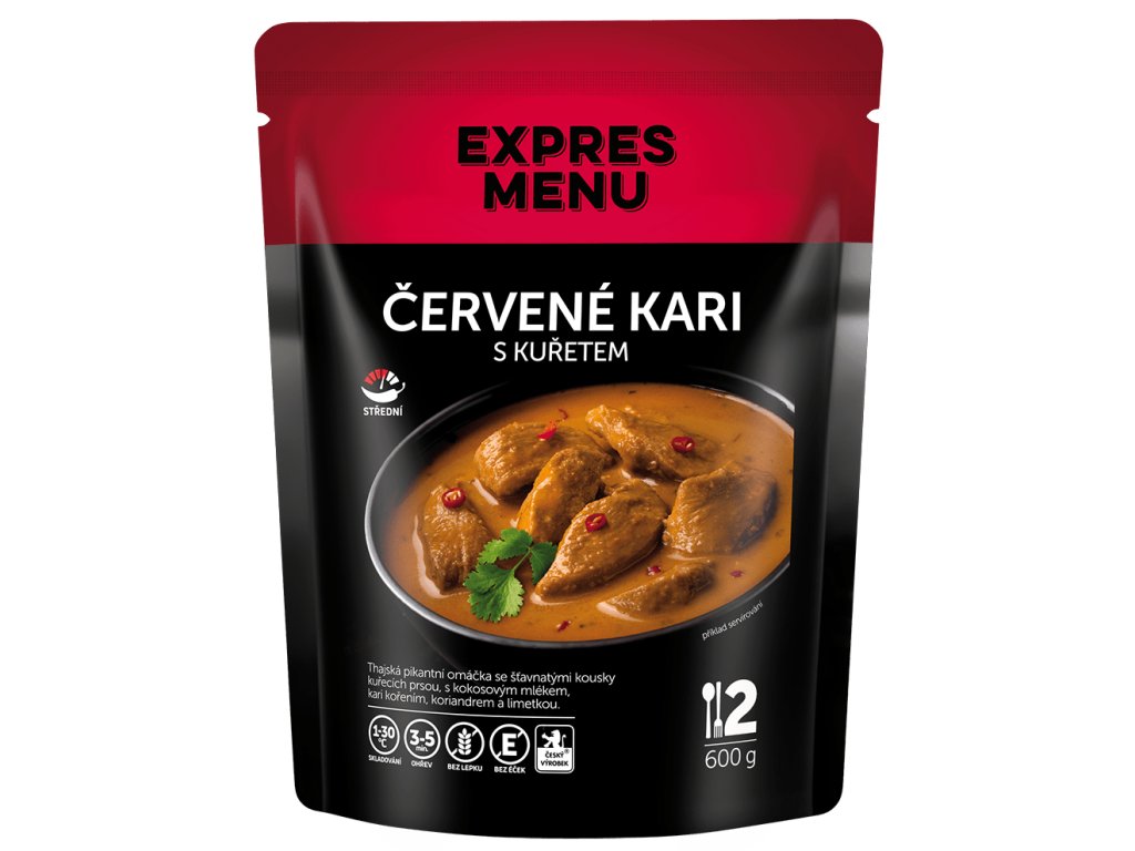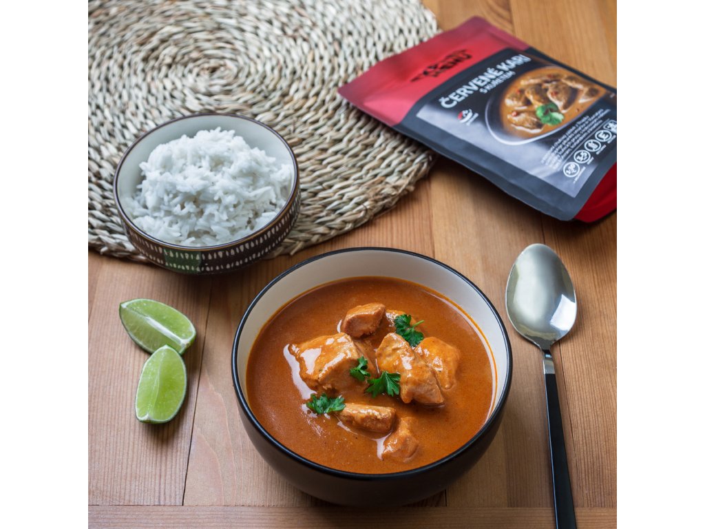 kuřecí prsa (33 %), cibule, kokosové mléko (kokos, voda), třtinový cukr, kari pasta červená (1,7 %) (sušené červené chilli 28 %, citronová tráva, česnek, sůl, šalotka, kaffir, galanga, koriandr, římský kmín), limetková šťáva, sezamový olej, rybí omáčka (extrakt z ančoviček 63 %, voda, sůl, cukr), sůl kamenná, rýžová mouka, kukuřičná mouka, koriandr, bazalka.
