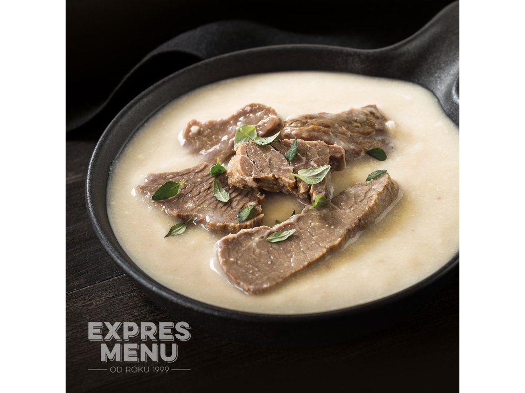 Křehký plátek hovězího masa s jemnou smetanovou omáčkou s příchutí křenu.