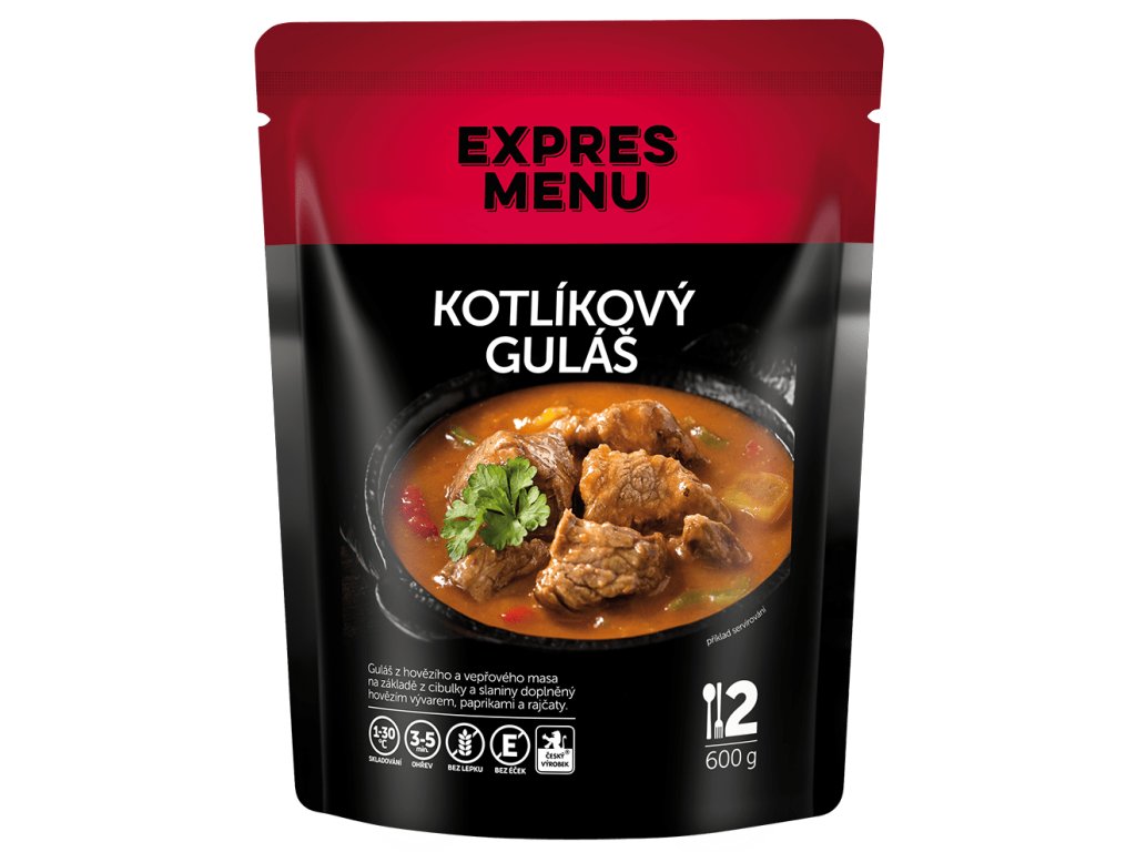 hovězí maso přední (16 %), vepřová plec (16 %), hovězí vývar (voda, hovězí maso a kosti), cibule, špek, rajčata, papriky, rýžová mouka, kukuřičná mouka, česnek, paprika mletá, sůl kamenná, pepř, majoránka.
