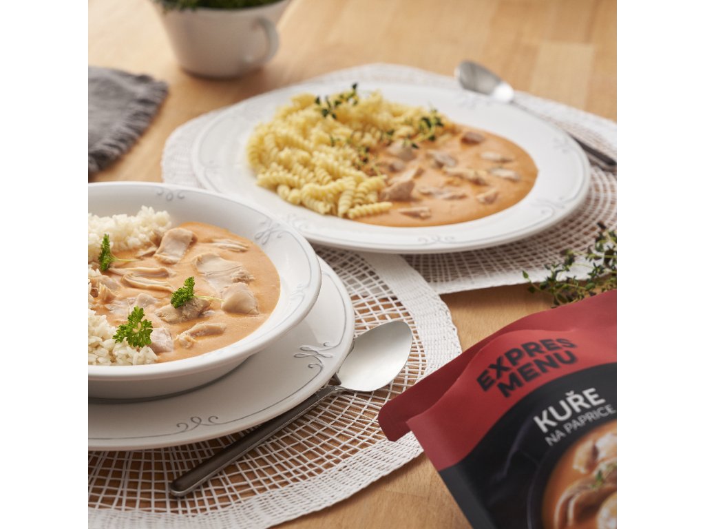 Šťavnaté kousky masa z kuřecích stehen, dušené doměkka v omáčce na cibulovém základu se sladkou paprikou. Omáčka je zjemněná smetanou.
