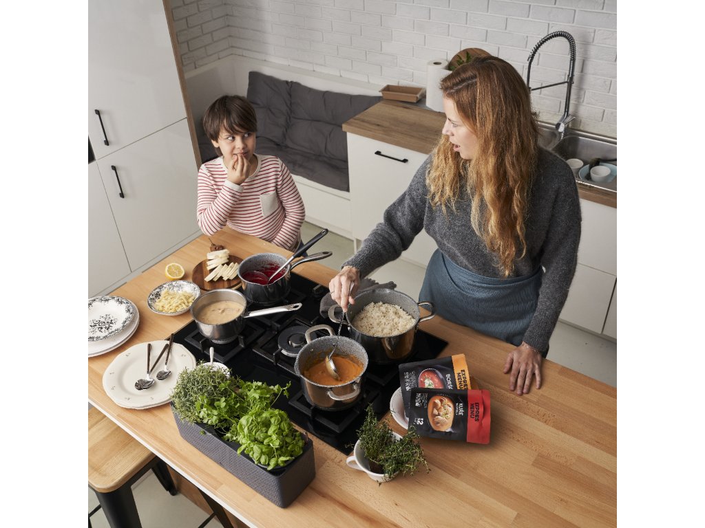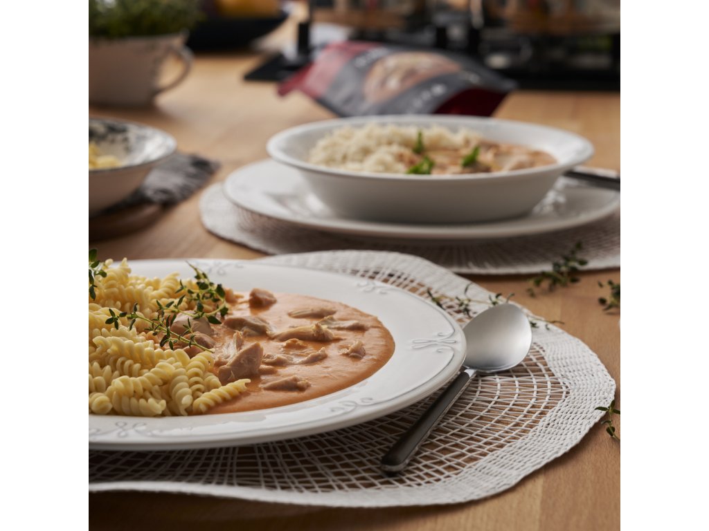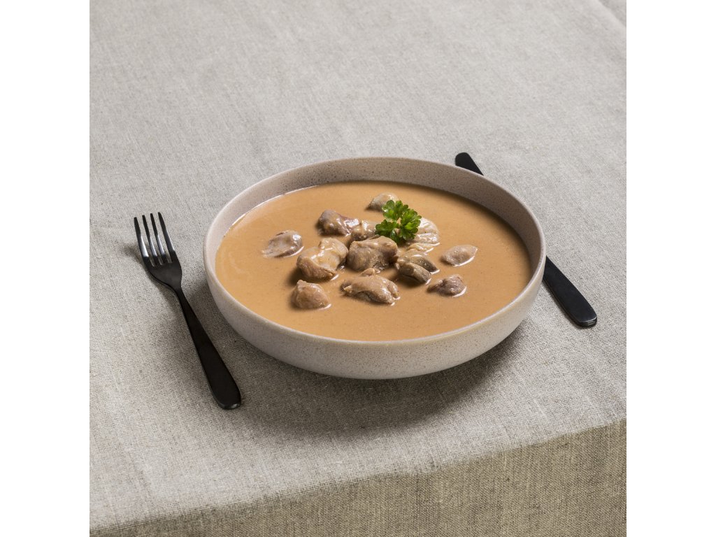 kuřecí maso stehenní (31 %), drůbeží vývar (voda, drůbeží maso a kosti), mléko, smetana, cibule, rýžová mouka, kukuřičná mouka, řepkový olej, sůl kamenná, paprika mletá.
