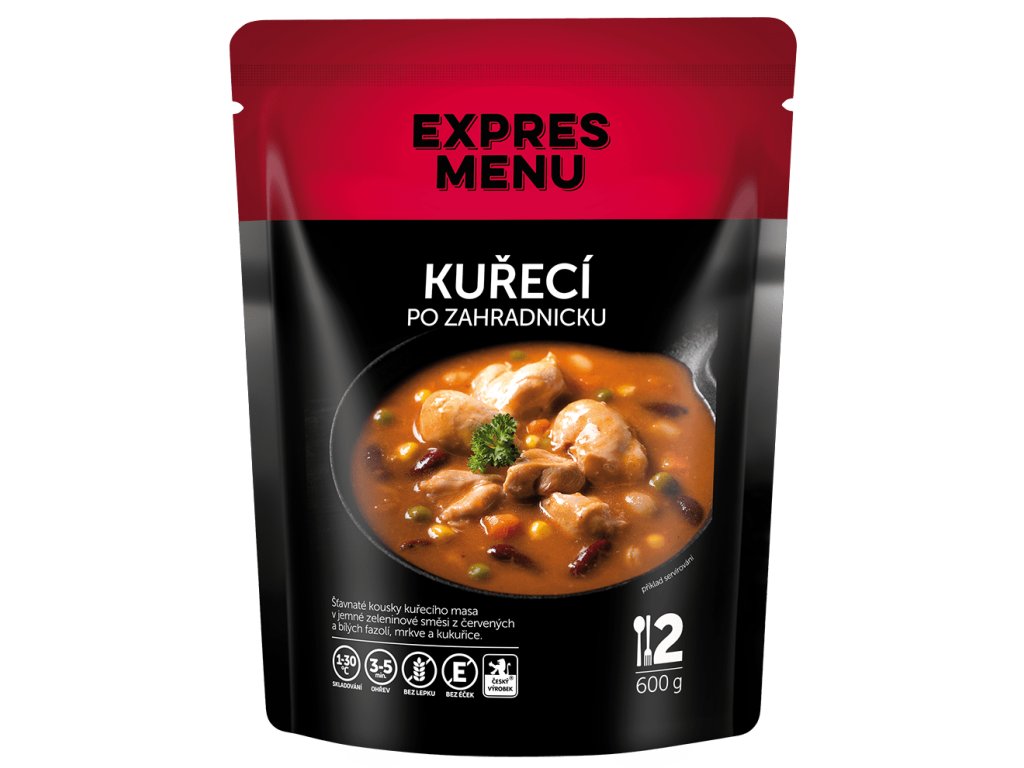 kuřecí stehenní maso (31 %), drůbeží vývar (voda, drůbeží maso a kosti), cibule, fazole, mrkev, hrášek, kukuřice, řepkový olej, rýžová mouka, kukuřičná mouka, sůl kamenná, paprika mletá, pepř, chilli.
