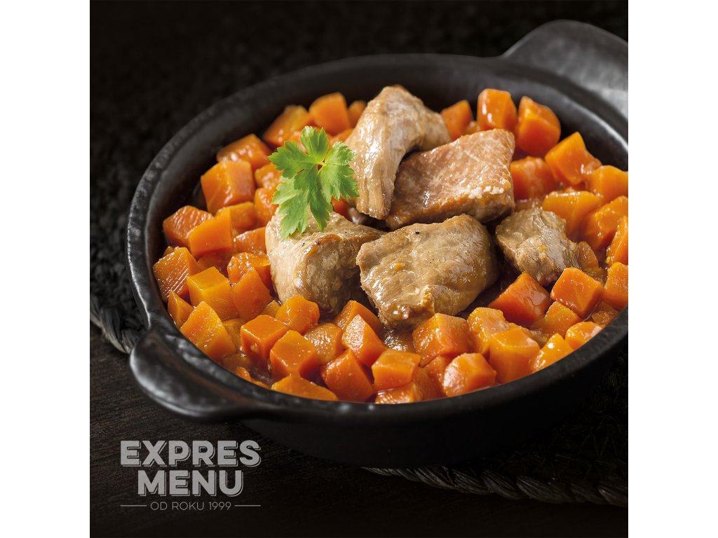Kostičky mrkve dušené na másle s kousky vepřového masa vytváří chutnou kombinaci.