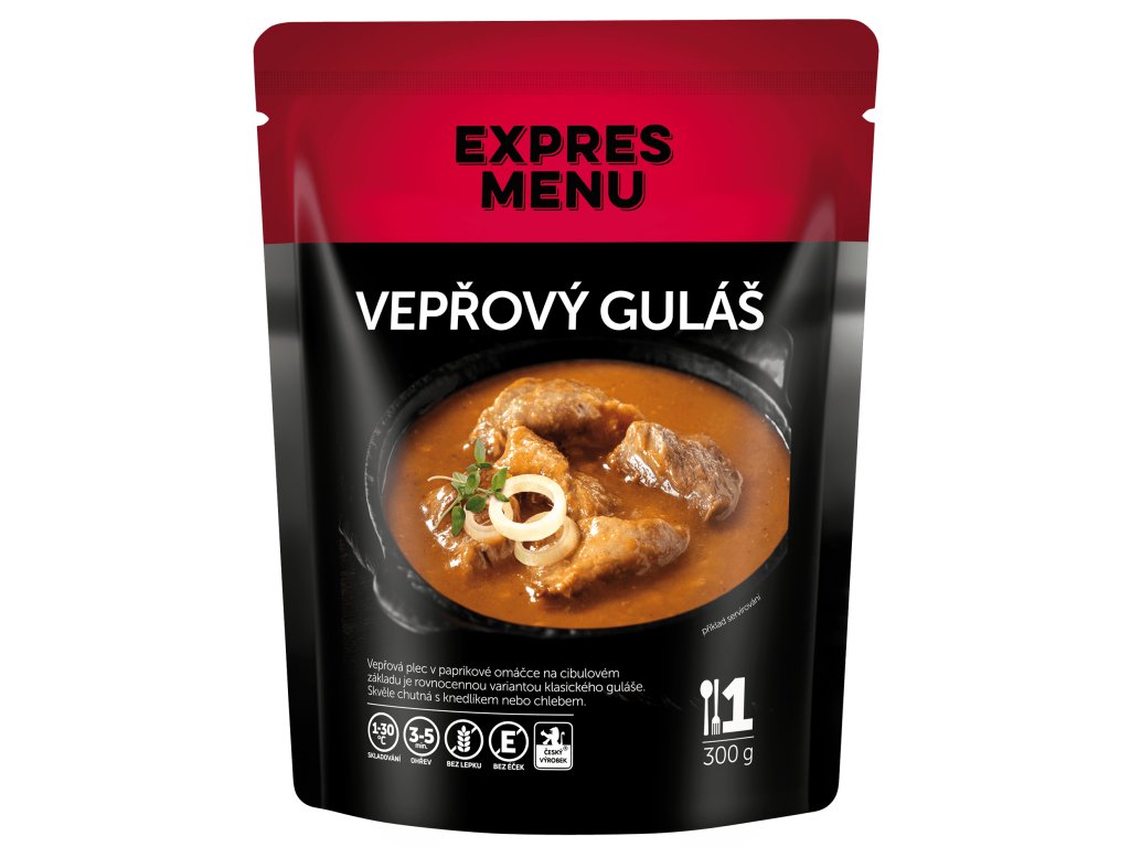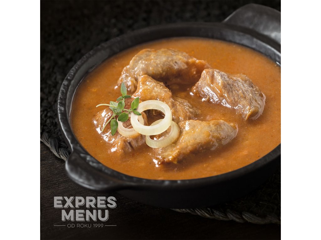 vepřová plec (33 %), hovězí vývar (voda, hovězí maso a kosti), cibule, rýžová mouka, kukuřičná mouka, řepkový olej, rajčatový protlak (voda, rajčatový protlak, sůl), paprika mletá, česnek, sůl kamenná, majoránka, kmín, pepř.